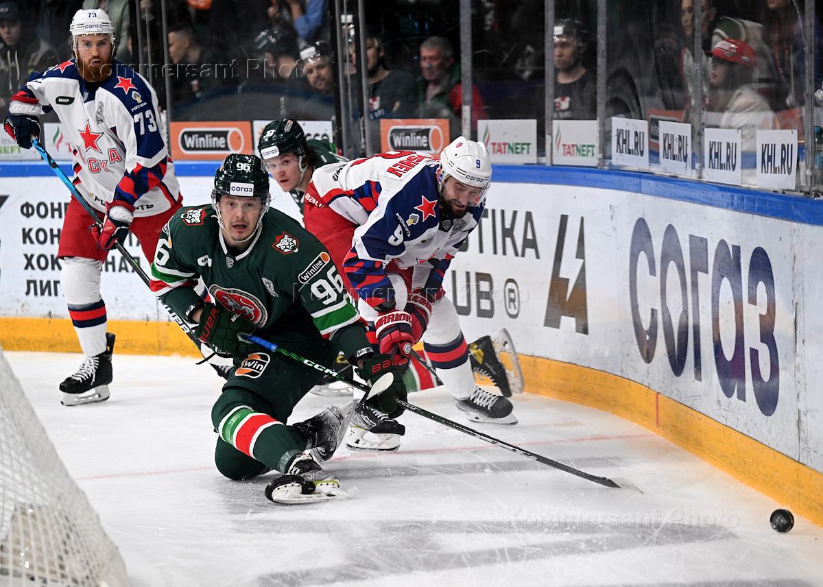 Континентальная хоккейная лига (КХЛ). Чемпионат сезона 2022/23. Плей-офф Кубка Гагарина. Финал. 5-й матч. Матч между командами "Ак Барс" (Казань) - ЦСКА (Москва) на стадионе "Татнефть-Арена". Игрок команды ЦСКА Владислав Каменев во время матча.
