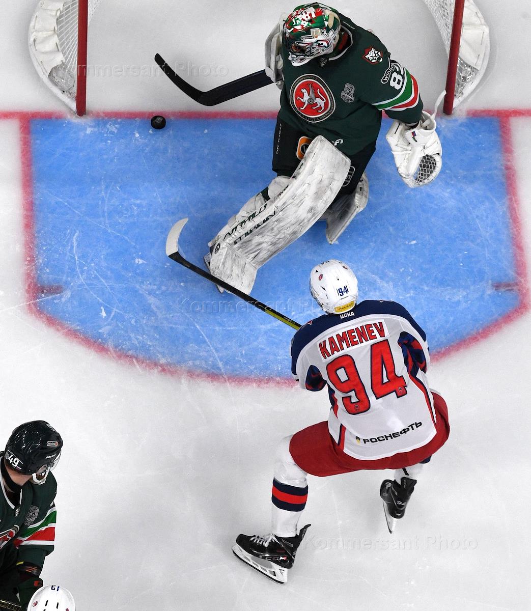 Континентальная хоккейная лига (КХЛ). Чемпионат сезона 2022/23. Плей-офф Кубка Гагарина. Финал. 5-й матч. Матч между командами "Ак Барс" (Казань) - ЦСКА (Москва) на стадионе "Татнефть-Арена". Вратарь команды ЦСКА Адам Рейдеборн (в центре) во время матча.