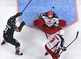 Continental Hockey League (KHL). Championship season 2022/23. Playoffs of the Gagarin Cup. The final. 5th match. Match between the teams "Ak Bars" (Kazan) - CSKA (Moscow) at the stadium "Tatneft-Arena". Ak Bars goalkeeper Timur Bilyalov and CSKA team player Vladislav Kamenev during the match.