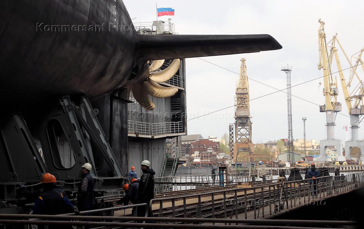 Церемония спуска на воду дизель-электрической подводной лодки "Можайск" проекта 636 на территории АО "Адмиралтейские верфи". Подлодка "Можайск" - пятая в серии из шести кораблей, которые строятся для Тихоокеанского флота России на АО "Адмиралтейские верфи" (входит в состав Объединенной судостроительной корпорации). Главнокомандующий Военно-Морским Флотом России Николай Евменов на церемонии. Экипаж лодки на церемонии.