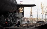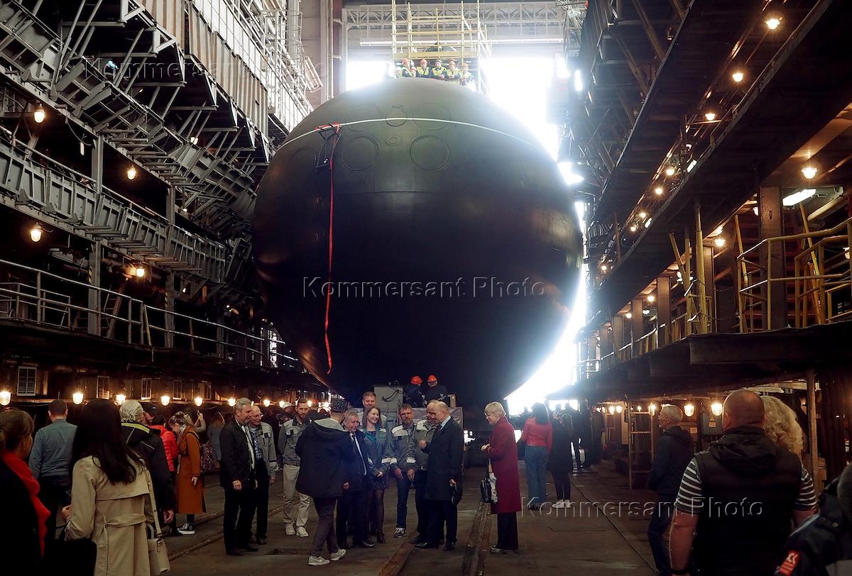 Церемония спуска на воду дизель-электрической подводной лодки "Можайск" проекта 636 на территории АО "Адмиралтейские верфи". Подлодка "Можайск" - пятая в серии из шести кораблей, которые строятся для Тихоокеанского флота России на АО "Адмиралтейские верфи" (входит в состав Объединенной судостроительной корпорации).