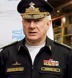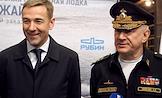 Церемония спуска на воду дизель-электрической подводной лодки "Можайск" проекта 636 на территории АО "Адмиралтейские верфи". Подлодка "Можайск" - пятая в серии из шести кораблей, которые строятся для Тихоокеанского флота России на АО "Адмиралтейские верфи" (входит в состав Объединенной судостроительной корпорации). Главнокомандующий Военно-Морским Флотом России Николай Евменов (справа) и статс-секретарь – заместитель министра промышленности и торговли России Виктор Евтухов (слева) на церемонии.
