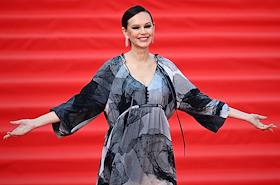 Closing ceremony of the 45th Moscow International Film Festival (MIFF) at the Moscow Musical Theatre. Actress Victoria Bogatyreva on the red carpet before the ceremony.