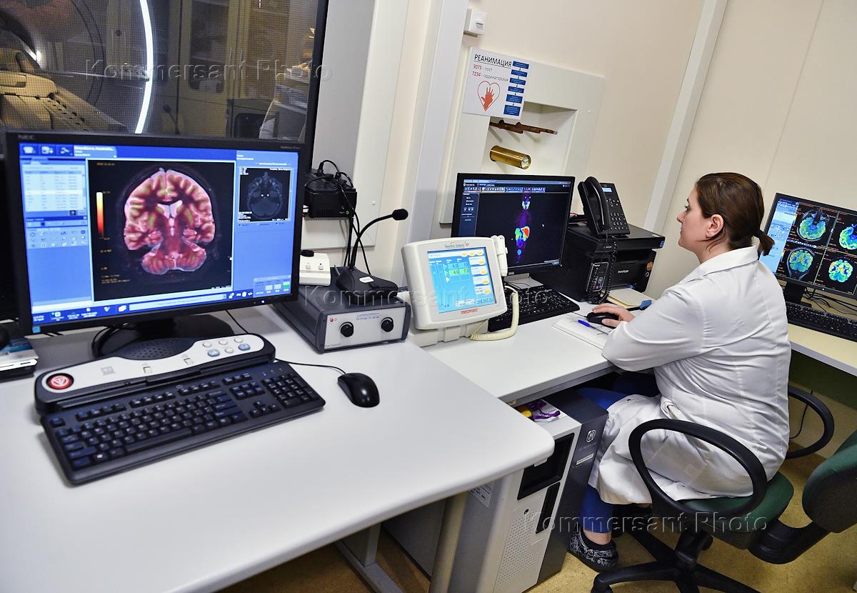 Расширенное заседание коллегии Федерального медико-биологического агентства (ФМБА) России, посвященное подведению итогов 2022 года и задачам на 2023 год в Федеральном центре мозга и нейротехнологий. Жанровая фотография. Медицинский работник во время исследования результатов компьютерной томографии.