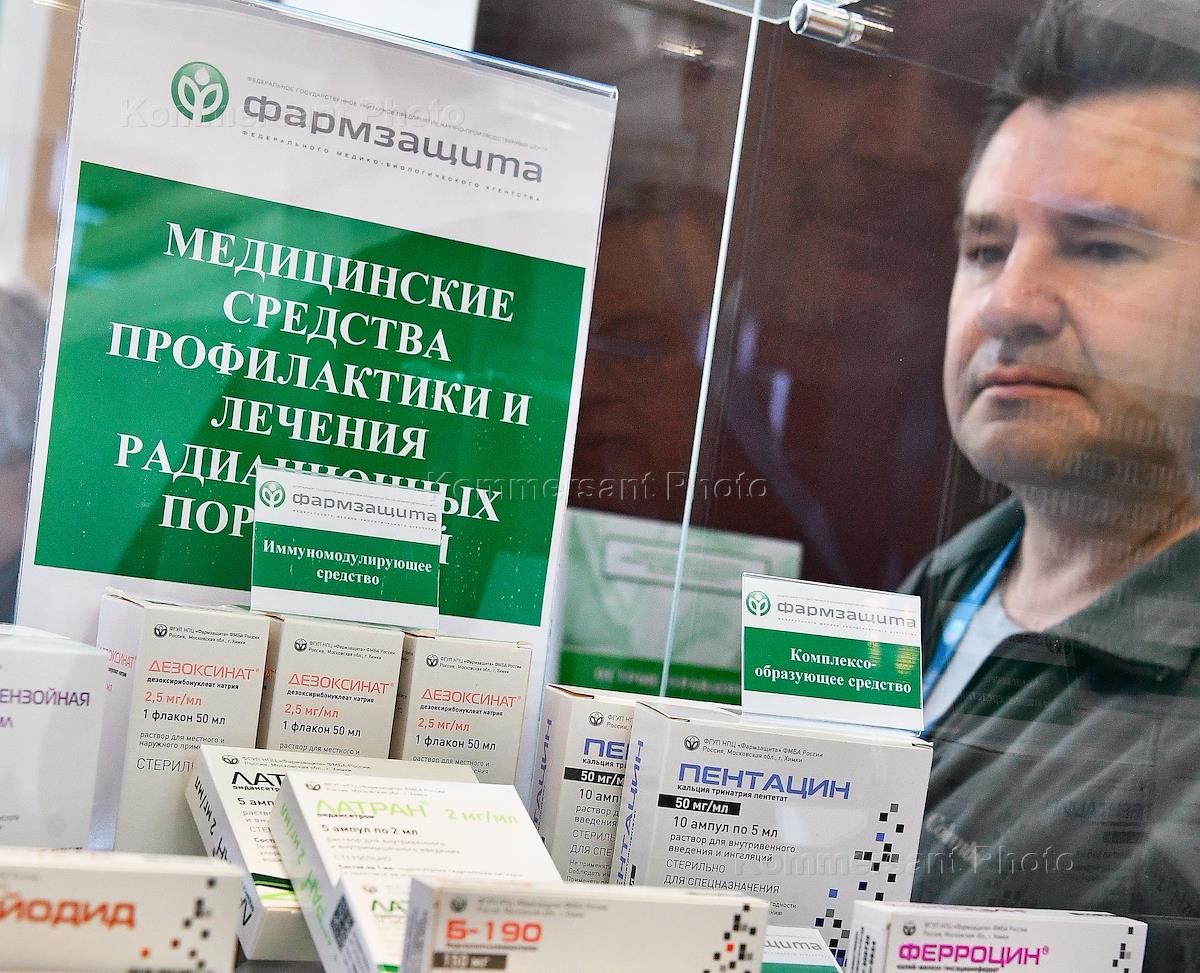 Расширенное заседание коллегии Федерального медико-биологического агентства (ФМБА) России, посвященное подведению итогов 2022 года и задачам на 2023 год в Федеральном центре мозга и нейротехнологий. Жанровая фотография. Выставочный стенд компании "Фармзащита".