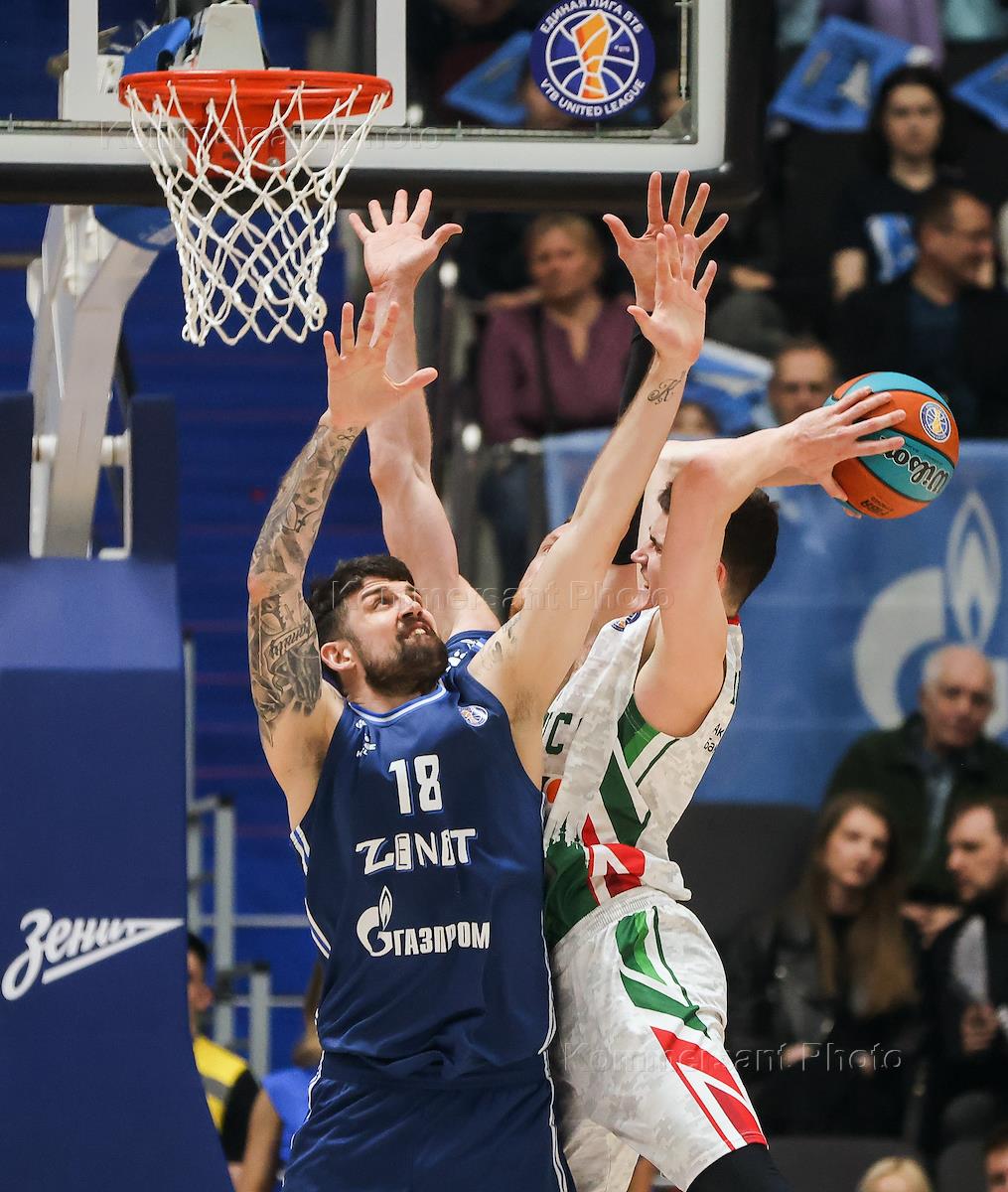 Единая лига ВТБ 2022/2023. 1/2 финала. Матч между командами "Зенит" (Санкт-Петербург) и УНИКС (Казань) на стадионе "Сибур Арена". Игрок команды "Зенит" Игорь Вольхин (слева) во время матча.