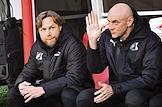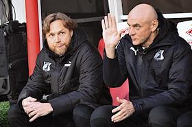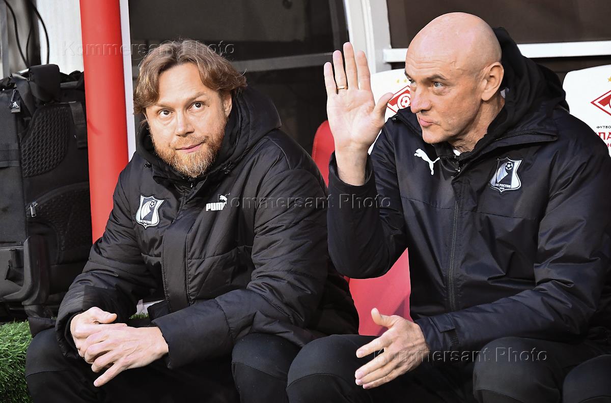 Russian Premier League (RPL). MIR - Russian Football Championship 2022/2023. 25th round. Match between the teams "Spartak" (Moscow) - "Rostov" (Rostov-on-Don) at the stadium "Otkritie Bank Arena". Rostov team head coach Valery Karpin (left) and Rostov team coach Viktor Onopko (right) during the match.