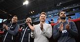 Russian Premier League (RPL). MIR - Russian Football Championship 2022/2023. 25th round. Match between the teams "Spartak" (Moscow) - "Rostov" (Rostov-on-Don) at the stadium "Otkritie Bank Arena". Rostov team head coach Valery Karpin (second from right) and Rostov team player Danil Glebov (center) during the match.