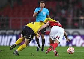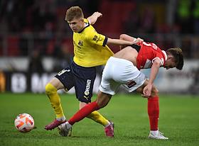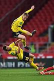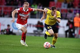 Russian Premier League (RPL). MIR - Russian Football Championship 2022/2023. 25th round. Match between the teams "Spartak" (Moscow) - "Rostov" (Rostov-on-Don) at the stadium "Otkritie Bank Arena". Rostov team player Alexei Mironov (left) and Spartak team player Mikhail Ignatov (right) during the match.