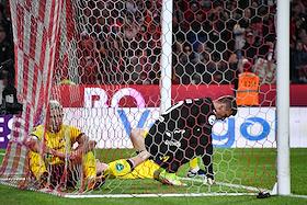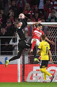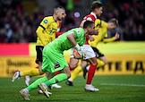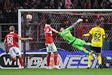 Russian Premier League (RPL). MIR - Russian Football Championship 2022/2023. 25th round. Match between the teams "Spartak" (Moscow) - "Rostov" (Rostov-on-Don) at the stadium "Otkritie Bank Arena". Rostov team goalkeeper Sergei Pesyakov (right) during the match.