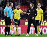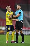 Russian Premier League (RPL). MIR - Russian Football Championship 2022/2023. 25th round. Match between the teams "Spartak" (Moscow) - "Rostov" (Rostov-on-Don) at the stadium "Otkritie Bank Arena". Rostov team player Alexei Mironov (left) and chief referee Kirill Levnikov during the match.