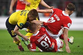 Russian Premier League (RPL). MIR - Russian Football Championship 2022/2023. 25th round. Match between the teams "Spartak" (Moscow) - "Rostov" (Rostov-on-Don) at the stadium "Otkritie Bank Arena". Left to right: Rostov team player Alexei Mironov, Spartak team players Daniil Denisov and Mikhail Ignatov during the match.