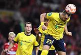 Russian Premier League (RPL). MIR - Russian Football Championship 2022/2023. 25th round. Match between the teams "Spartak" (Moscow) - "Rostov" (Rostov-on-Don) at the stadium "Otkritie Bank Arena". Spartak team player Alexander Sobolev (right) and Rostov team player Danil Glebov (center) during the match.