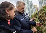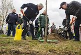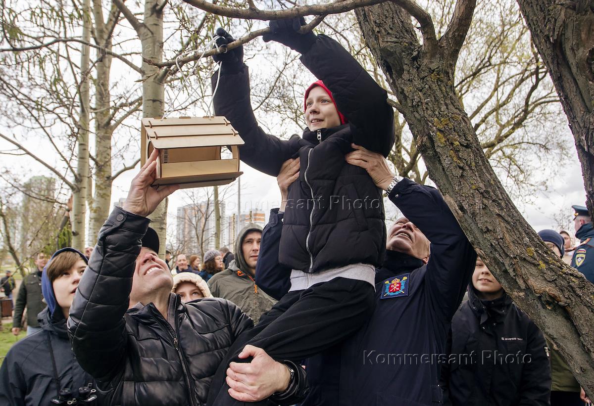 Рабочая поездка вице-губернатора Санкт-Петербурга Анатолия Повелия в Парк культуры и отдыха "Парк Героев-Пожарных" Фрунзенского района в рамках акции "Всё для Победы!". Общегородская акция "Добрый субботник". Вице-губернатор Санкт-Петербурга Анатолий Повелий помогает участнику субботника повесить кормушку для птиц.
