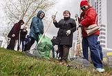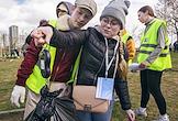 Общегородская акция "Добрый субботник" в Парке культуры и отдыха "Парк Героев-Пожарных" Фрунзенского района. Жанровая фотография. Участники субботника во время уборки мусора.