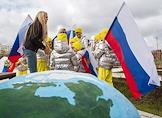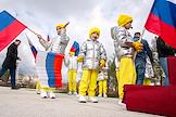 Общегородская акция "Добрый субботник" в Парке культуры и отдыха "Парк Героев-Пожарных" Фрунзенского района. Жанровая фотография. Детский танцевальный коллектив с флагами России перед выступлением во время акции.