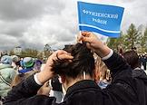 Общегородская акция "Добрый субботник" в Парке культуры и отдыха "Парк Героев-Пожарных" Фрунзенского района. Жанровая фотография. Посетители парка с флажками с надписью "Фрунзенский район" во время акции.