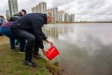 Рабочая поездка вице-губернатора Санкт-Петербурга Анатолия Повелия в Парк культуры и отдыха "Парк Героев-Героев-Пожарных" Фрунзенского района в рамках акции "Всё для Победы!". Вице-губернатор Санкт-Петербурга Анатолий Повелий выпускает рыбу в пруд во время общегородской акции "Добрый субботник" в парке.