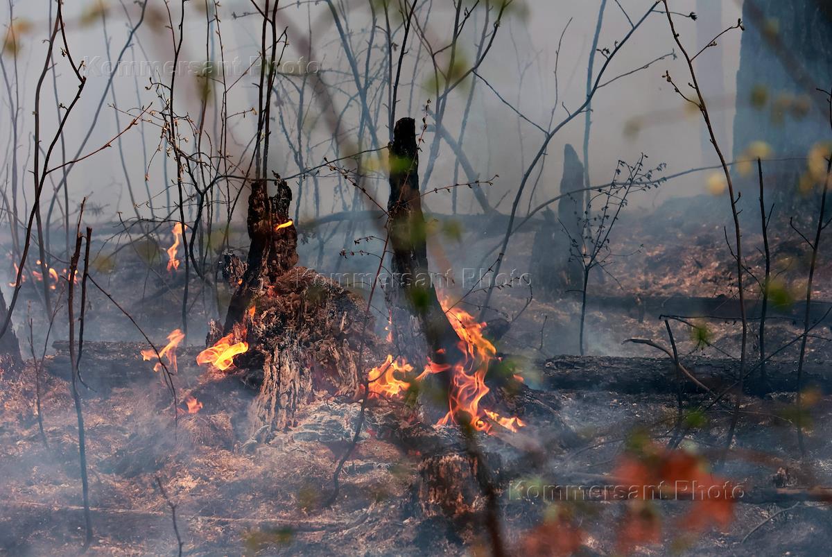 Ситуация в Режевском городском округе, где из-за пожаров объявлен режим чрезвычайной ситуации. Жанровая фотография. Волонтеры во время проливки отдельных очагов горения.