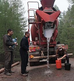 Ситуация в Режевском городском округе, где из-за пожаров объявлен режим чрезвычайной ситуации. Жанровая фотография. Люди возле автомобиля с водой.