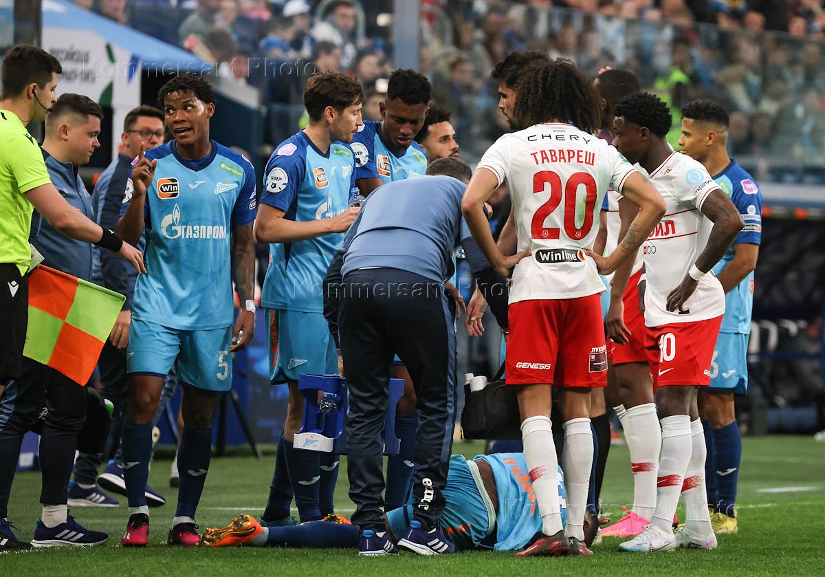 Russian Premier League (RPL). MIR - Russian Football Championship 2022/2023. 25th round. Match between the teams "Zenit" (St. Petersburg) - "Spartak" (Moscow) at the stadium "Gazprom Arena". Spartak team player Victor Mozes (third from right) during the match.