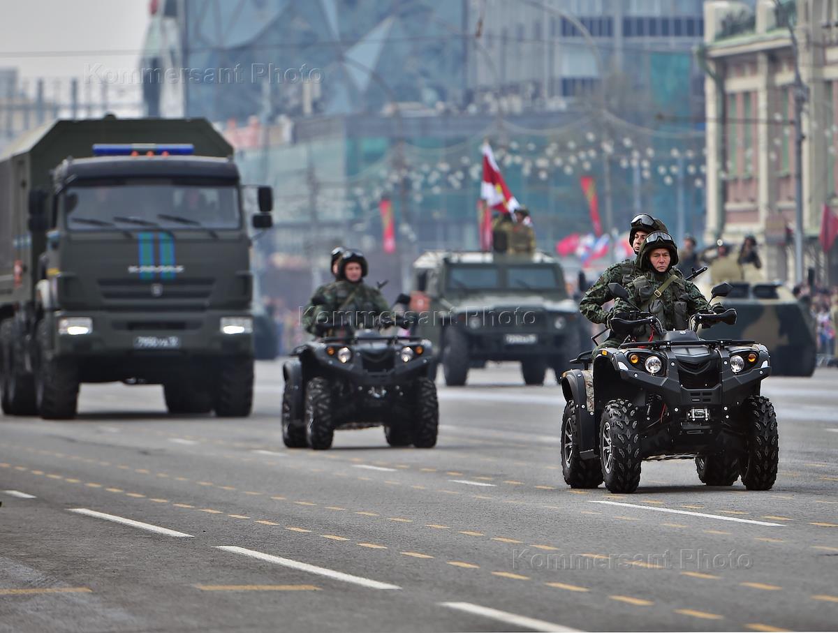 Празднование Дня Победы. Парад, посвященный 78-й годовщине Победы в Великой Отечественной войне, на площади Ленина. Военные квадроциклы Polaris во время парада.