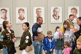 Празднование 78-й годовщины Победы в Великой Отечественной войне. Жанровая фотография. Жители на фоне портретов Героев Советского Союза.