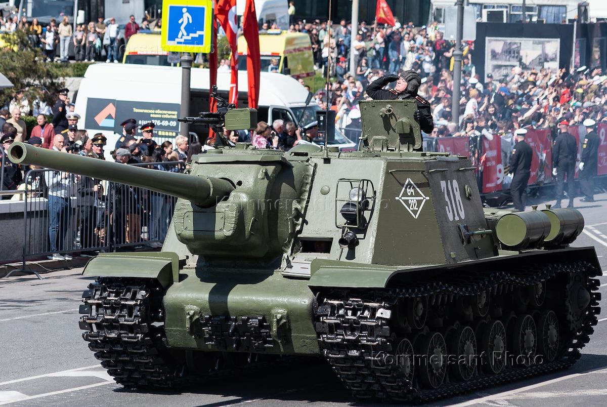 Военный парад, посвященный 78-ой годовщине Победы в Великой Отечественной войне, прошел на улице Светланской во Владивостоке. Проход военной техники во время парада. Самоходная артиллерийская установка ИСУ-122.