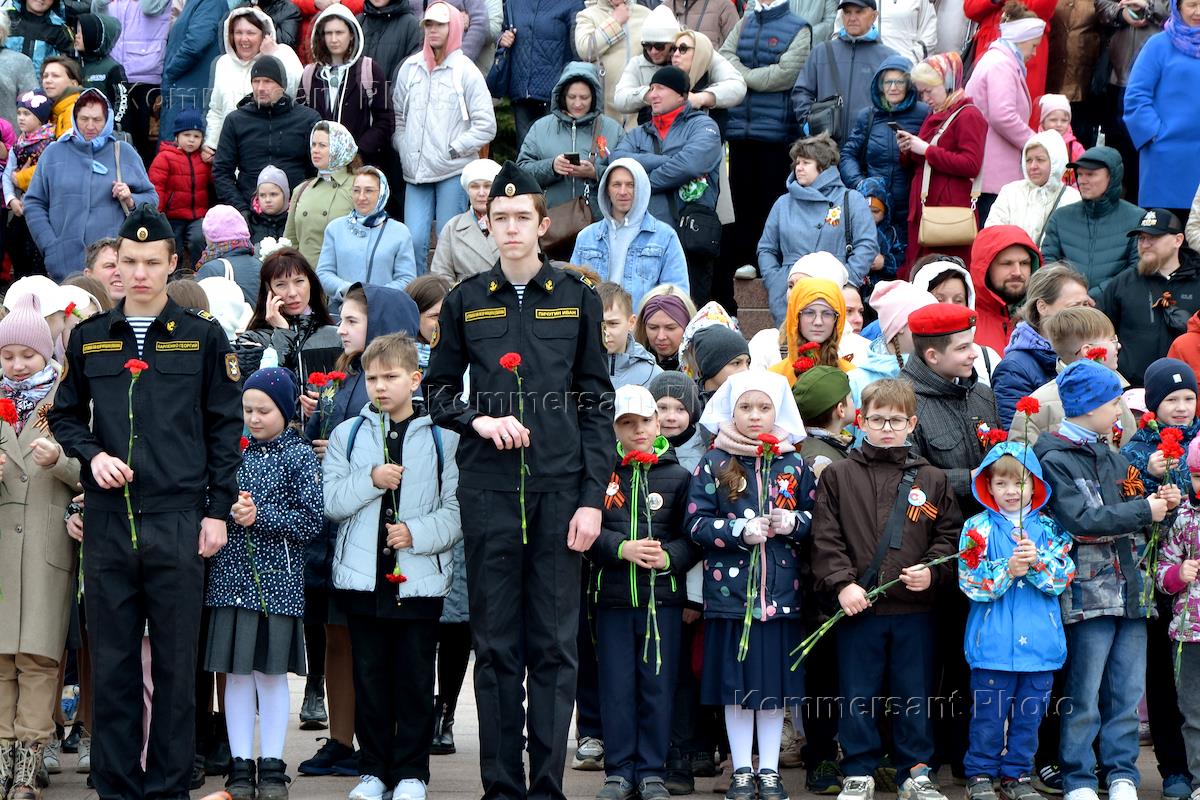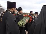 Праздничные мероприятия, посвященные 78-й годовщине Победы в Великой Отечественной войне, в Нижнем Новгороде. Торжественная церемония возложения цветов духовенством Нижегородской епархии к мемориалу "Вечный огонь" в память о погибших в годы Великой Отечественной войны. Жанровая фотография.