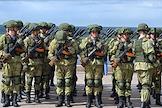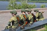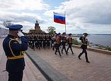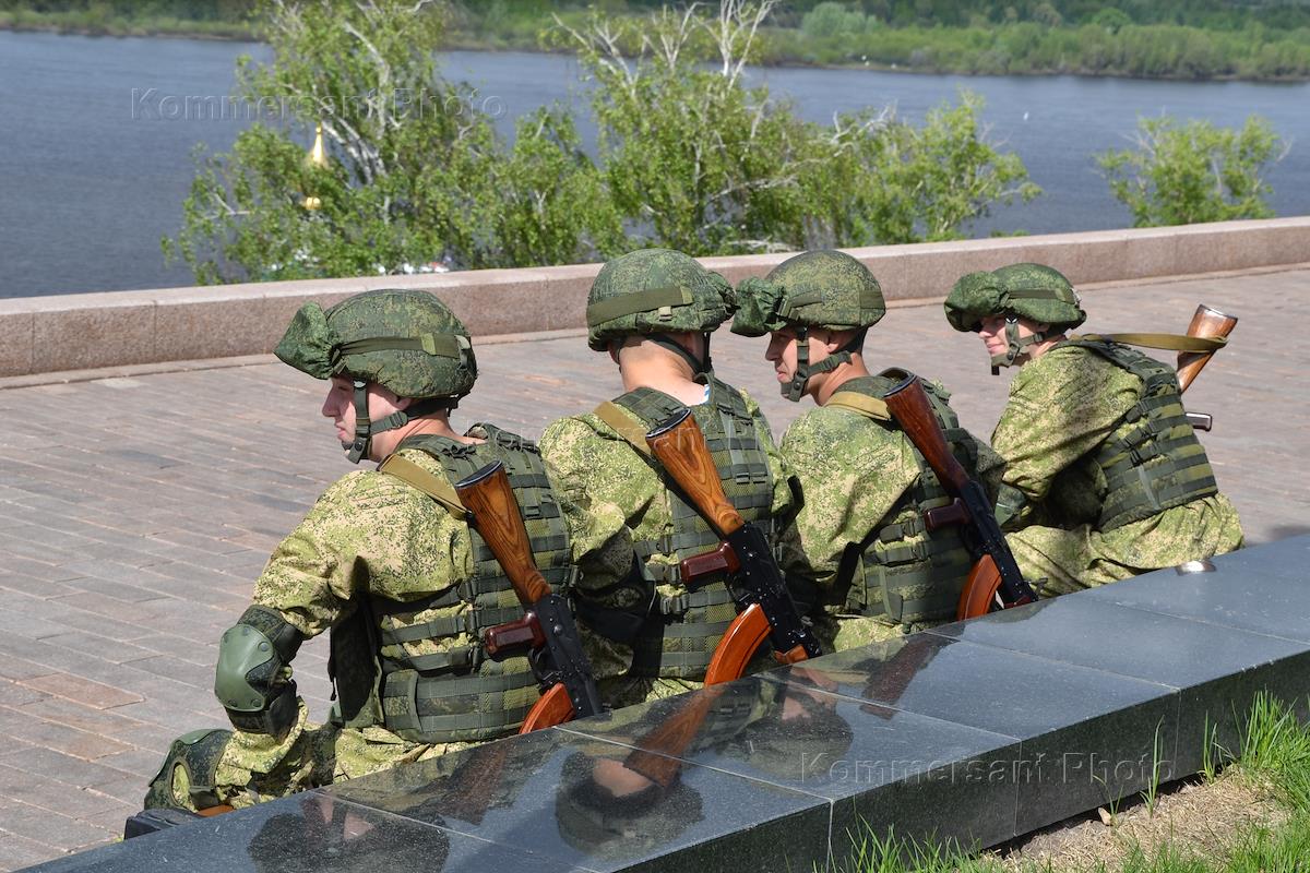 Праздничные мероприятия, посвященные 78-й годовщине Победы в Великой Отечественной войне, в Нижнем Новгороде. Торжественная церемония возложения цветов духовенством Нижегородской епархии к мемориалу "Вечный огонь" в память о погибших в годы Великой Отечественной войны. Жанровая фотография. Военнослужащие перед началом церемонии.