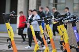 Виды Москвы. Жанровая фотография. Электросамокаты компании "Яндекс GO" на парковке проката на улице Крымский вал у Парка Горького.