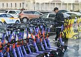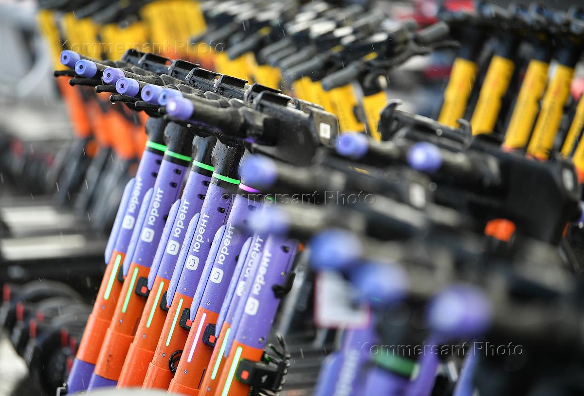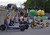 Жанровая фотография. Электросамокаты компании "Юрент" на парковке проката.