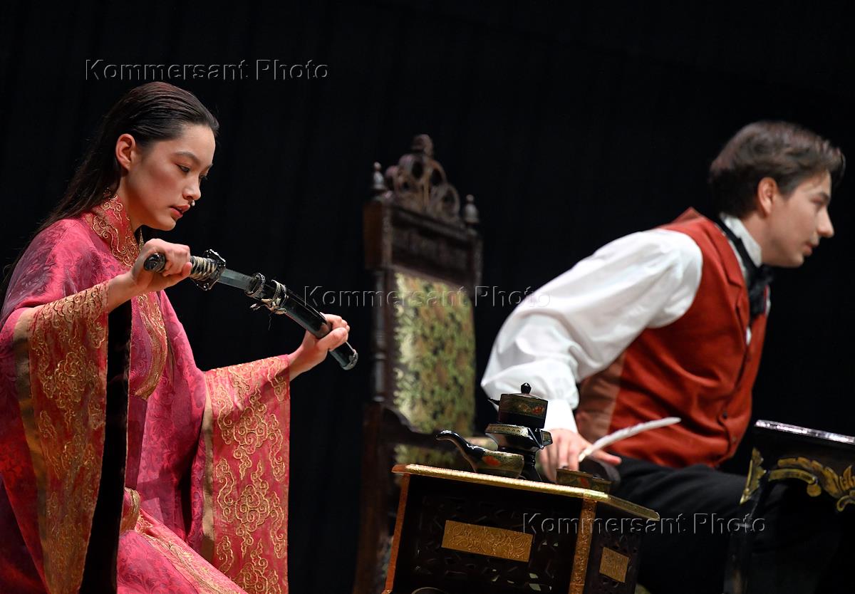 Премьера спектакля "Богатые невесты. Новый сезон" по мотивам пьес А.Н.Островского "Богатые невесты" и "Невольницы" в постановке режиссера Кирилла Вытоптова на сцене Театра на Бронной. Актеры Диана Огай и Богдан Жилин во время спектакля.