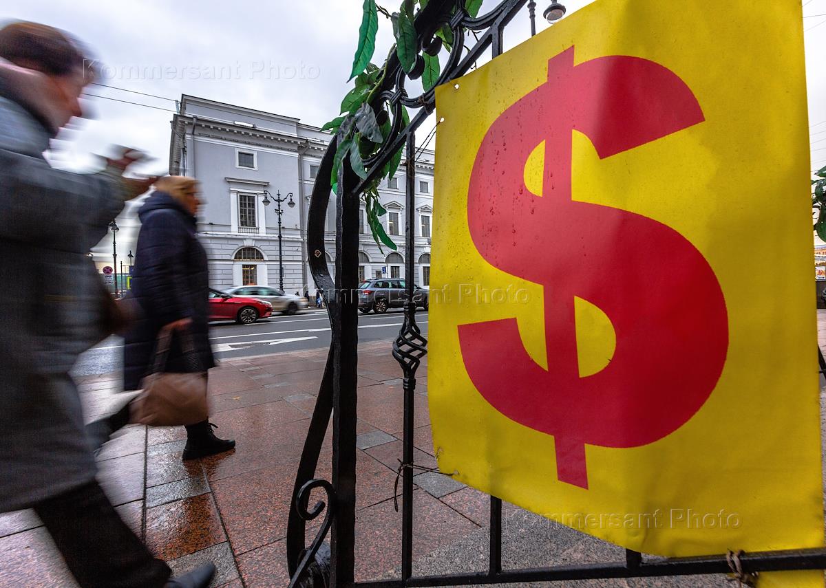Views of St. Petersburg. Genre photography. Banner with a dollar sign on a cast iron fence.