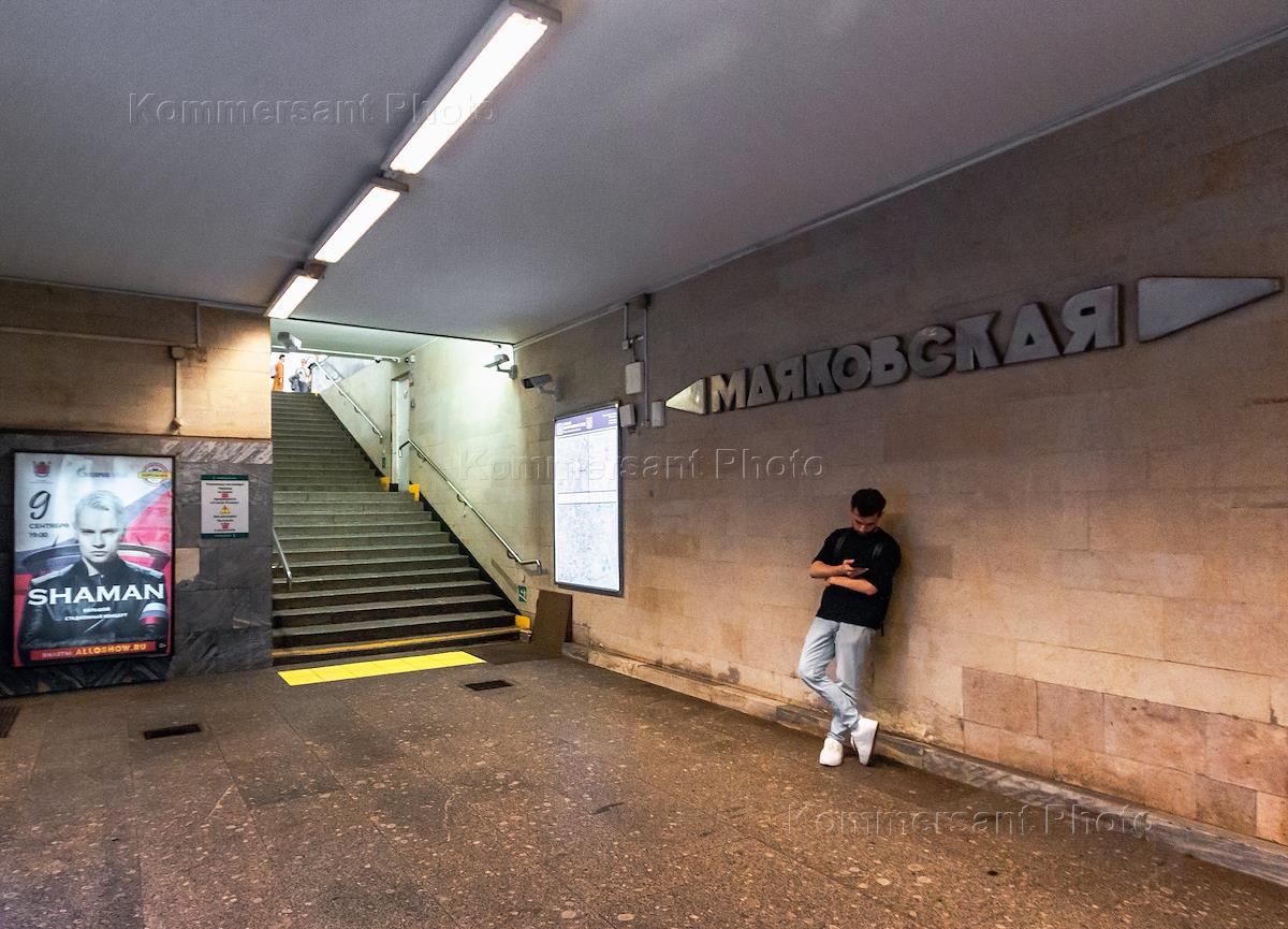Виды Санкт-Петербурга. Жанровая фотография. Указатель станции метро "Маяковская" в подземном переходе.