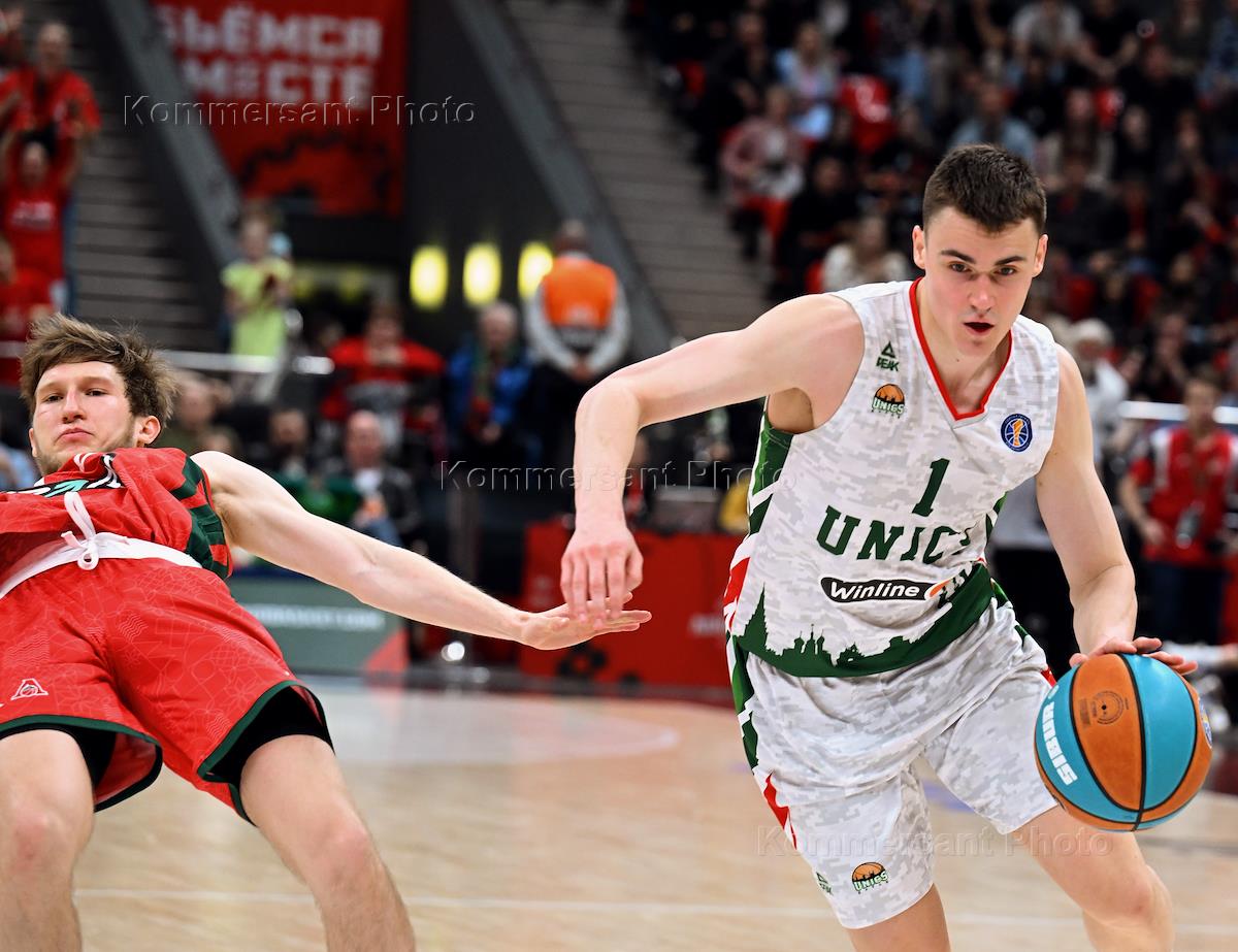Единая лига ВТБ по баскетболу. Финал. Матч между командами "Локомотив-Кубань" (Краснодар)- УНИКС (Казань) на стадионе "Баскет-холл"(Краснодар). Игрок команды "Локомотив-Кубань" Захар Ведищев (справа) во время матча.