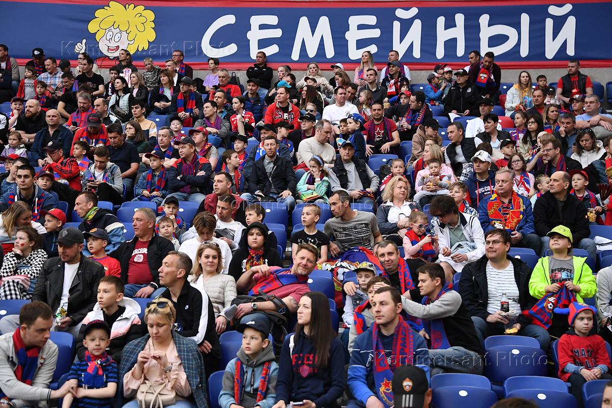 Российская Премьер-Лига (РПЛ). МИР - Чемпионат России по футболу 2022/2023. 27-й тур. Матч между командами ЦСКА (Москва) - "Торпедо" (Москва) на стадионе "ВЭБ Арена". Болельщики на трибуне во время матча.