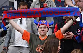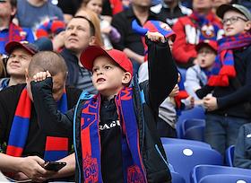 Российская Премьер-Лига (РПЛ). МИР - Чемпионат России по футболу 2022/2023. 27-й тур. Матч между командами ЦСКА (Москва) - "Торпедо" (Москва) на стадионе "ВЭБ Арена". Жанровая фотография. Листовка "Доставка еды на трибуну. Яндекс.Еда" в руках у девочки.