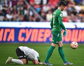 Российская Премьер-Лига (РПЛ). МИР - Чемпионат России по футболу 2022/2023. 27-й тур. Матч между командами ЦСКА (Москва) - "Торпедо" (Москва) на стадионе "ВЭБ Арена". Вратарь команды "Торпедо" Егор Бабурин (справа) во время матча.