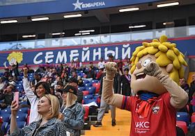 Российская Премьер-Лига (РПЛ). МИР - Чемпионат России по футболу 2022/2023. 27-й тур. Матч между командами ЦСКА (Москва) - "Торпедо" (Москва) на стадионе "ВЭБ Арена". Болельщики и ростовая кукла - талисман объединения юных болельщиков футбольного клуба ЦСКА на зрительской трибуне перед началом матча.
