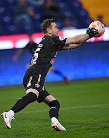 Российская Премьер-Лига (РПЛ). МИР - Чемпионат России по футболу 2022/2023. 27-й тур. Матч между командами ЦСКА (Москва) - "Торпедо" (Москва) на стадионе "ВЭБ Арена". Вратарь команды "Торпедо" Егор Бабурин во время матча.