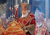Божественная литургия в честь принесения Феодоровской иконы Божией Матери из Богоявленско-Анастасииного монастыря Костромы в кафедральный собор Храма Христа Спасителя. Патриарх Московский и Всея Руси Кирилл во время богослужения.