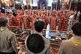 Божественная литургия в честь принесения Феодоровской иконы Божией Матери из Богоявленско-Анастасииного монастыря Костромы в кафедральный собор Храма Христа Спасителя. Священнослужители во время богослужения.