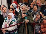 Божественная литургия в честь принесения Феодоровской иконы Божией Матери из Богоявленско-Анастасииного монастыря Костромы в кафедральный собор Храма Христа Спасителя. Верующие во время богослужения.