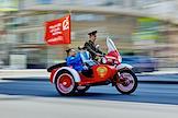 Ежегодный весенний мотофестиваль в честь открытия мотосезона. Жанровая фотография. Участники фестиваля едут на мотоцикле со Знаменем Победы.