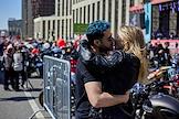 Ежегодный весенний мотофестиваль в честь открытия мотосезона. Жанровая фотография. Молодой человек и девушка целуются на фестивале.