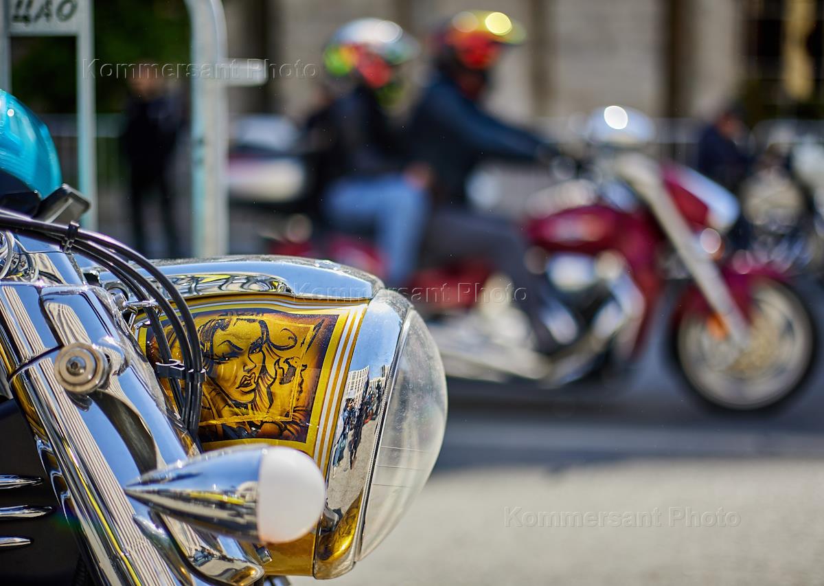 Ежегодный весенний мотофестиваль в честь открытия мотосезона. Жанровая фотография. Рисунок на фаре мотоцикла.