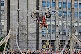 Ежегодный весенний мотофестиваль в честь открытия мотосезона. Жанровая фотография. Мотоциклист во время выполнения трюков на фестивале.