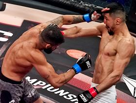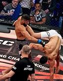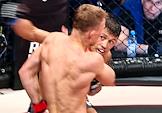 Турнир по смешанным единоборствам и кикбоксингу RCC 15 в спортивном комплексе "Арена Уралец". Российский боец Денис Лаврентьев (слева) и бразильский боец Эдуардо Дантаса (справа) во время боя.