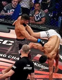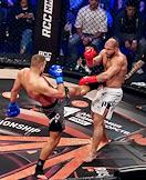 Турнир по смешанным единоборствам и кикбоксингу RCC 15 в спортивном комплексе "Арена Уралец". Российский боец Василий Семенов (в центре) и белорусский боец Жора Акопян (слева) во время боя.